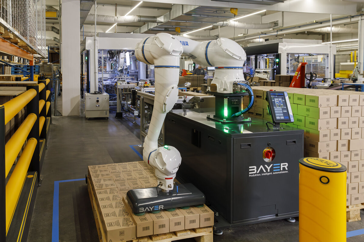 Ein zentrales Element der Lösung ist der von Bayer entwickelte Vakuumgreifer. Dieser ist geeignet für das Handling von Kartons, Trays, Kanister und Kleinladungsträgern sowie für Sonderanwendungen. Als Roboter arbeiten im PLT HC Palettiersystem standardmäßig Cobots der Baureihe HC („HC“ steht für „Human Collaborative“) von Yaskawa mit wahlweise 10, 20 oder 30 kg Tragkraft.